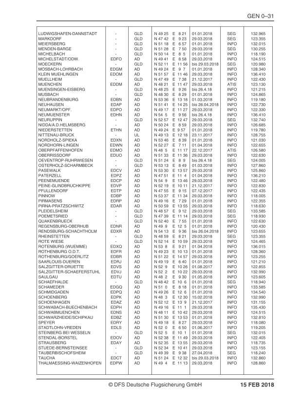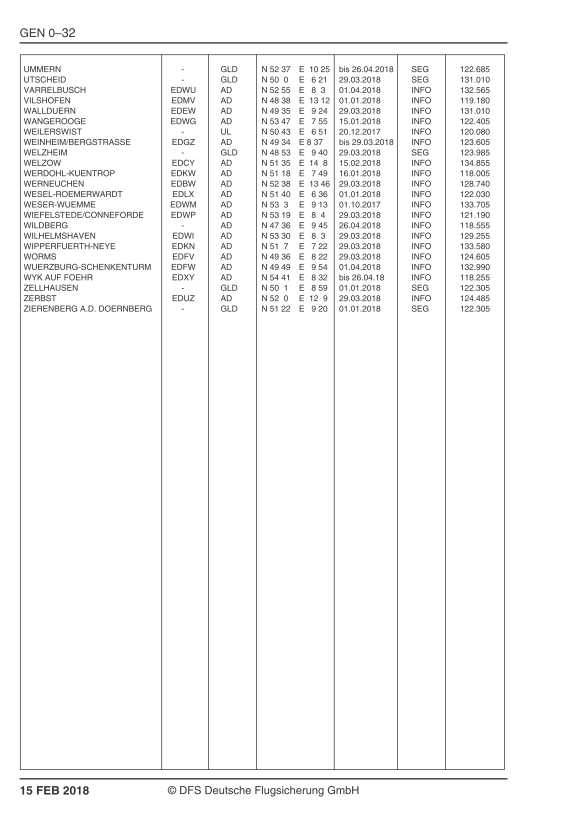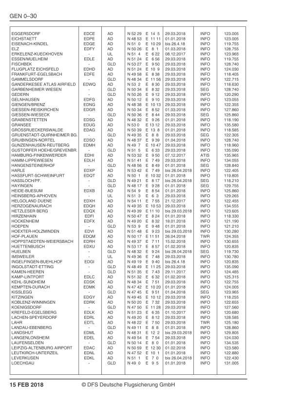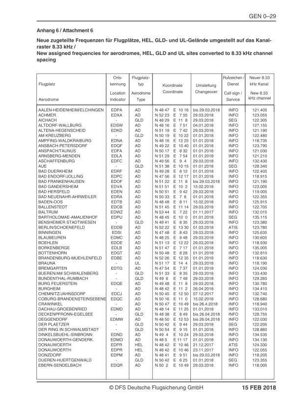 Als Vorabinformation finden Sie unten die für das AIP VFR AMDT 15 FEB 18 geplanten Seiten aus der AIP VFR Kapitel GEN, mit den für VFR–Piloten relevanten, neuen 8.33 kHz–Frequenzen an Flugplätzen.
