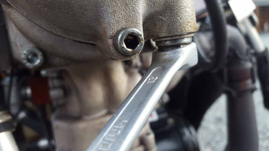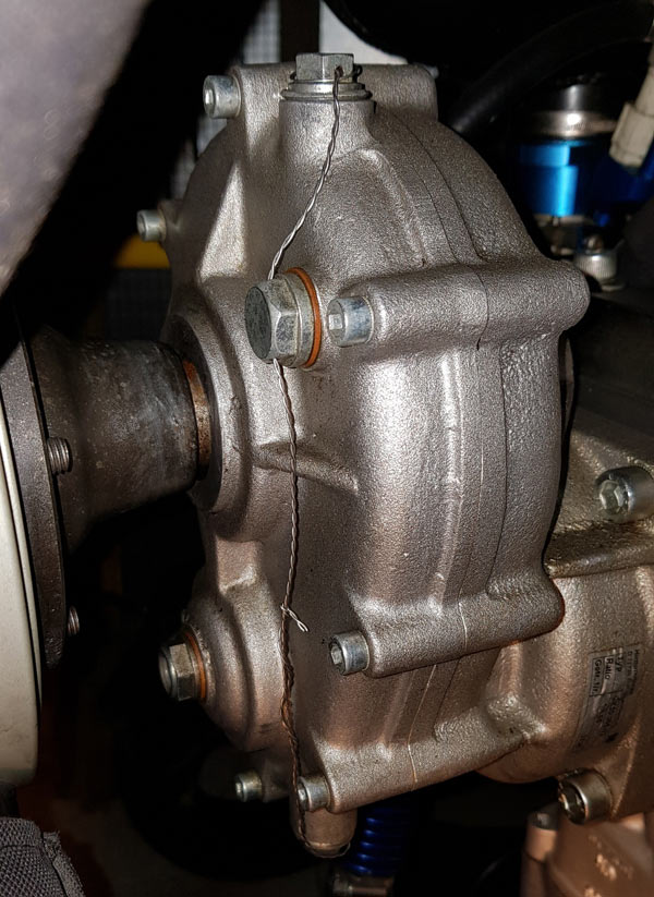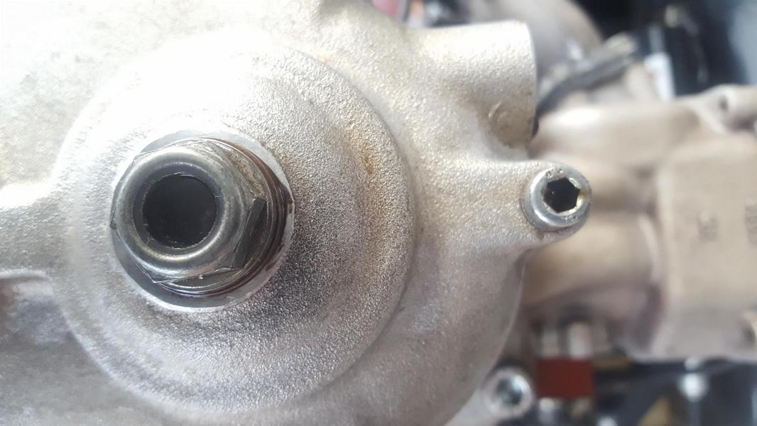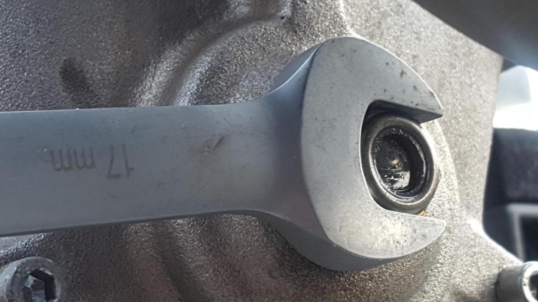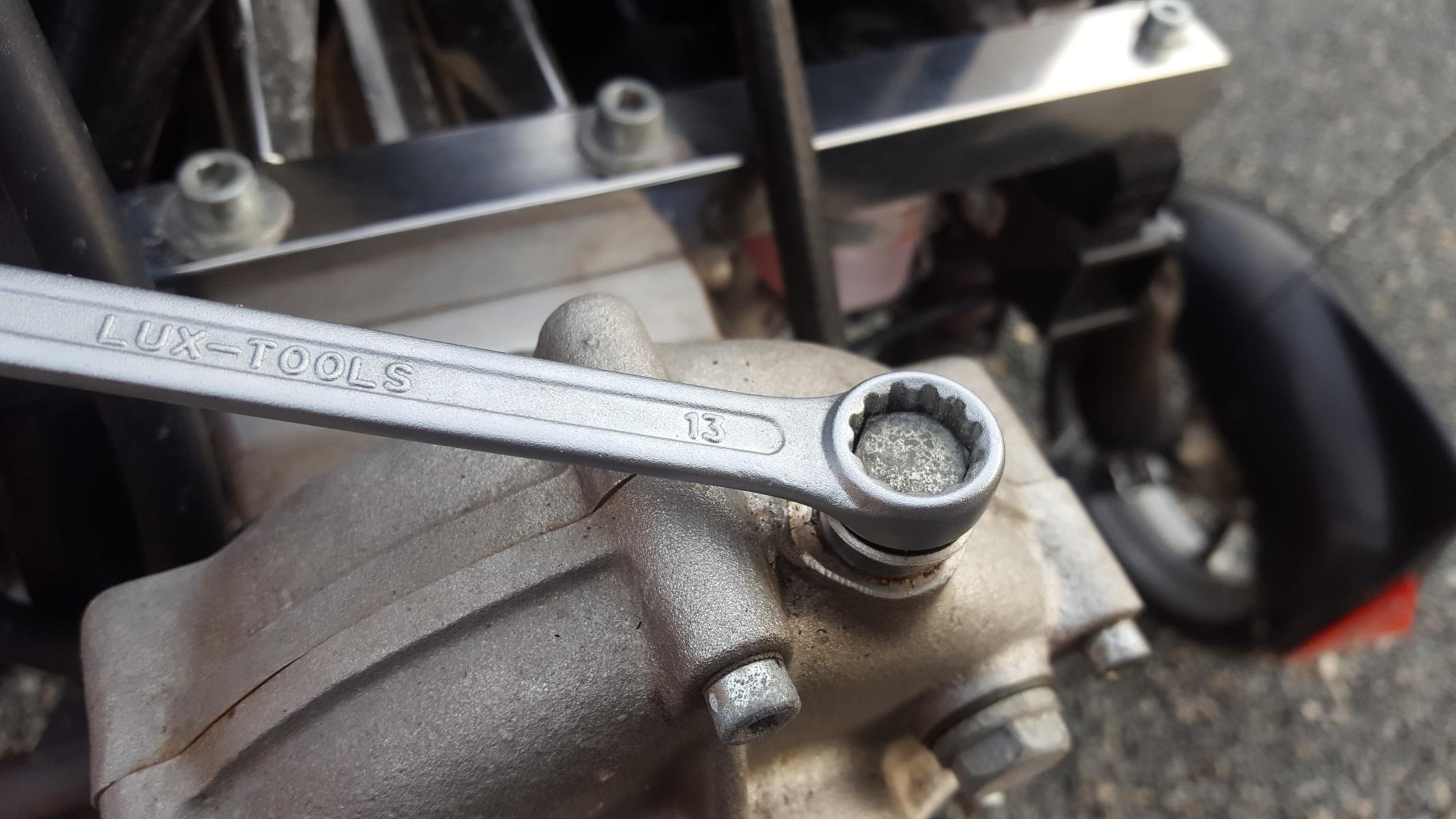 Das Getriebe hat 3 Schrauben: Einlaß (13er Schlüssel) Auslaß unten (13er Schlüssel) und die Schraube mit dem Kontrollfenster (17er Schraube).