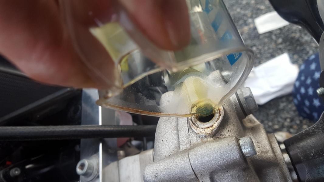Lösung: Xcitor grade hinstellen, nicht aufgebockt. Schraubt die Schraube mit dem Kontrollfenster auf, das Öl läuft raus. Jetzt wieder zudrehen und oben aufmachen (wenn nicht noch offen) und schlückchenweise mit Öl (ca je 5ml weise) auffüllen. Warten, bis es unten angekommen ist und man (endlich) eine schöne Blase hat.