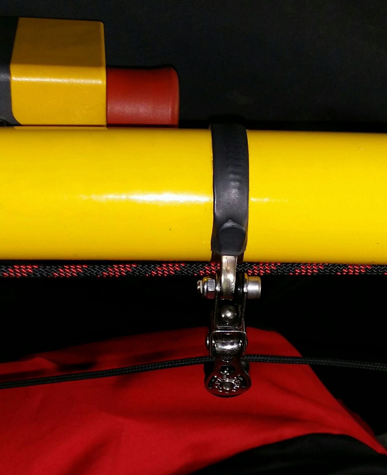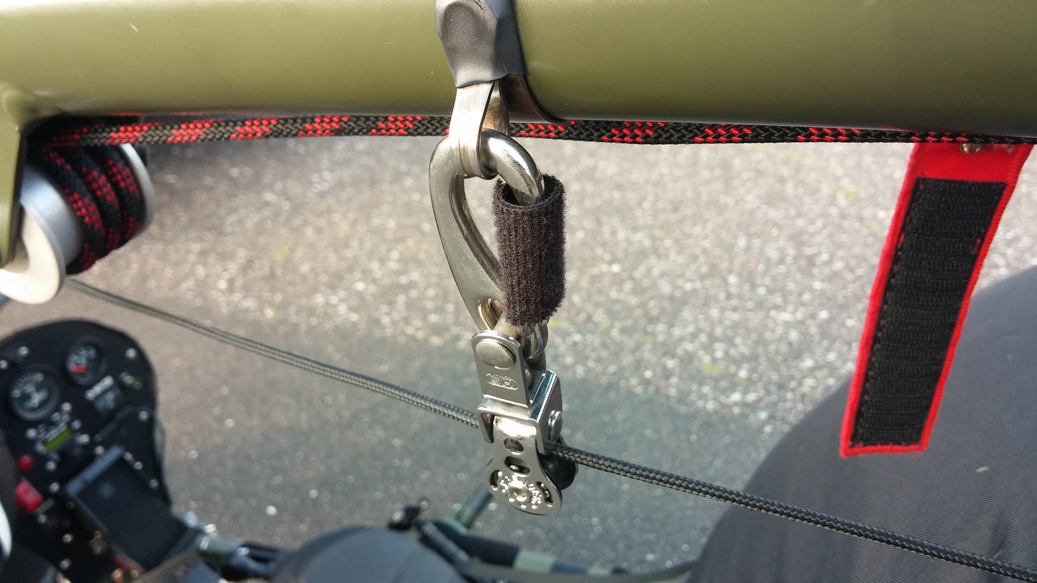 Empfehlung ist das Sichern mit Klettband, Kabelbinder oder Ringöse, um ein Aushaken zu verhindern. Solange man die Steuerleinen in der Hand hält ist es kein Problem. Wenn dies im Flug passieren sollte, dann kommt man ohne Passagier während des Fluges nicht mehr an die Steuerleine heran.