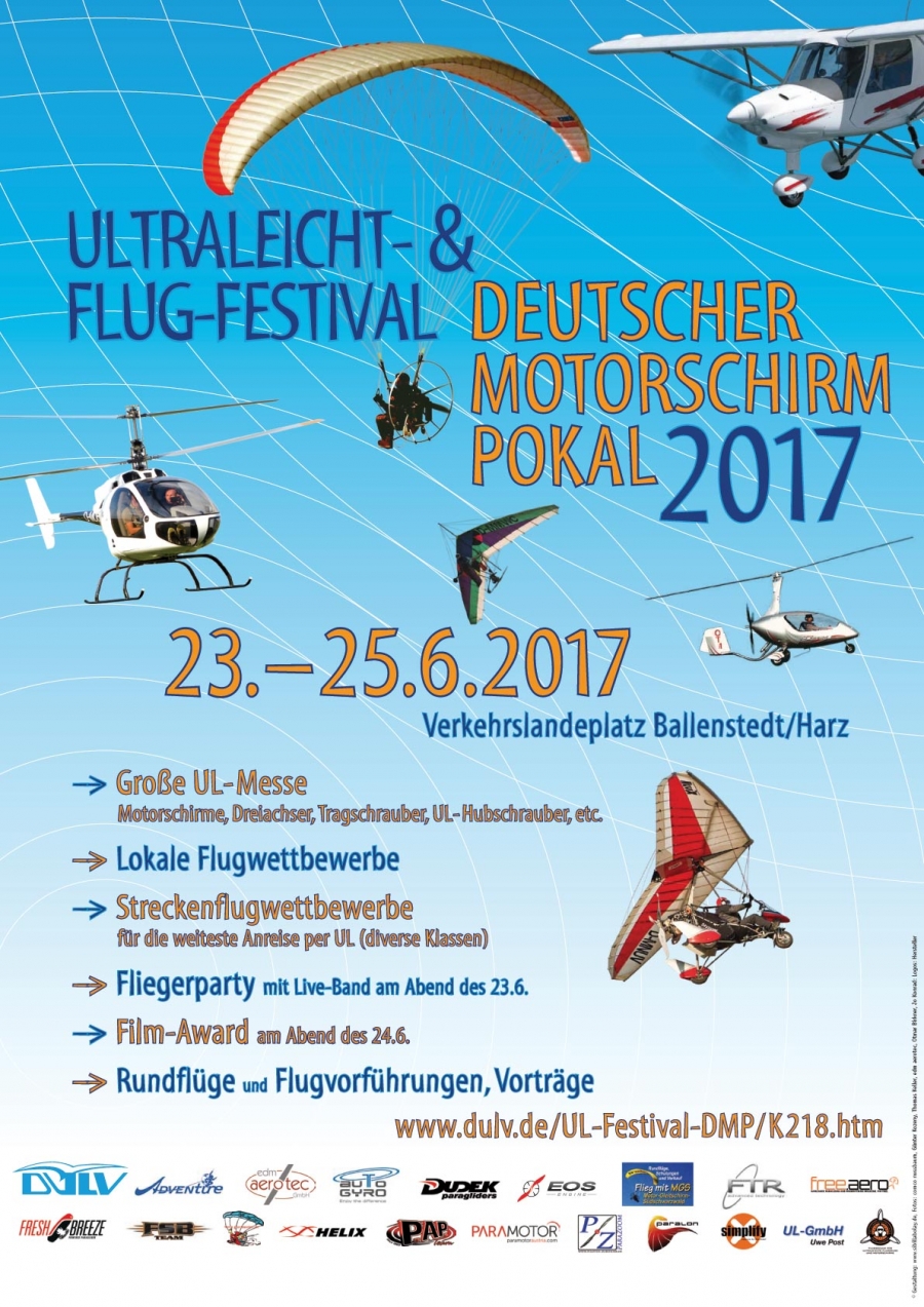 Der Deutsche Motorschirm Pokal (DMP) geht vom 23. bis 25. Juni 2017 in eine neue Runde. Austragungsort ist wie gewohnt der Verkehrslandeplatz Ballenstedt, am Rand des nördlichen Harzes.