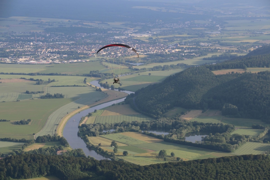 Malerisch schlängelt sich die Weser durch das gleichnahmige Bergland. Der Flugplatz liegt auf einem Plateau und eine breite Wiese (wenn sie benutzt werden darf) ermöglicht starts in jede Richtung.